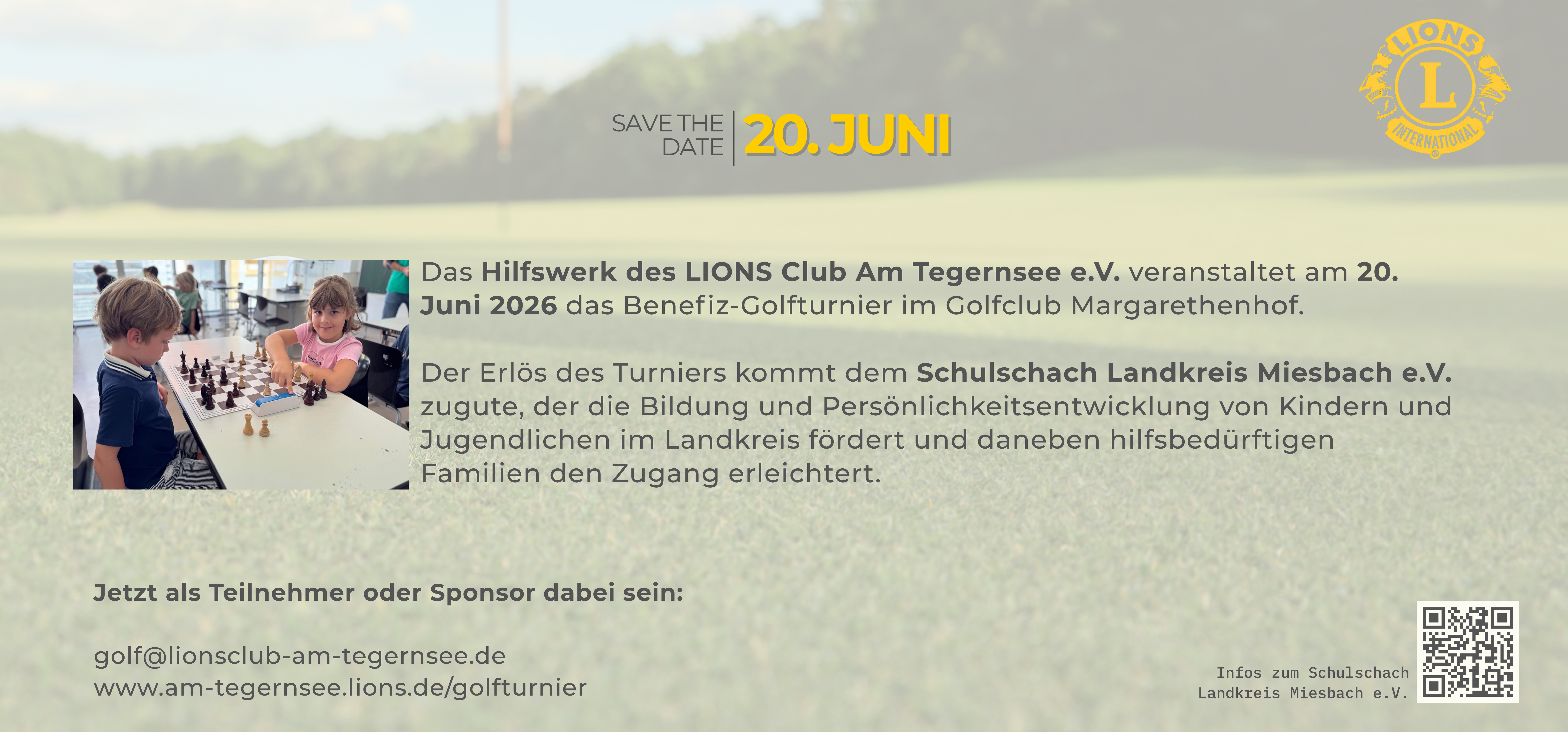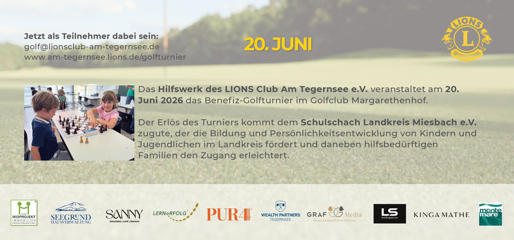 Mit größter Freude konnte der Traum des Lions Golf Teams rund um Irmi Schützenberger (Activity Beauftragte des LC) mit Rosalie Kollmer, Alexa Kaiser sowie Jannik Heine, Leiter Golf Clubs am Margarethenhof und Torsten Kiener (Direktor Lanserhof) in Waakirchen erfüllt werden; nämlich der Traum, den bedürftigen Kindern und Jugendlichen im LK Miesbach die Teilnahme am Schach-Unterricht kostenlos weiterhin nach dem normalen Schulunterricht zu ermöglichen. Darüber hinaus können dadurch die Kursgebühren langfristig gering und familienfreundlich gehalten werden.